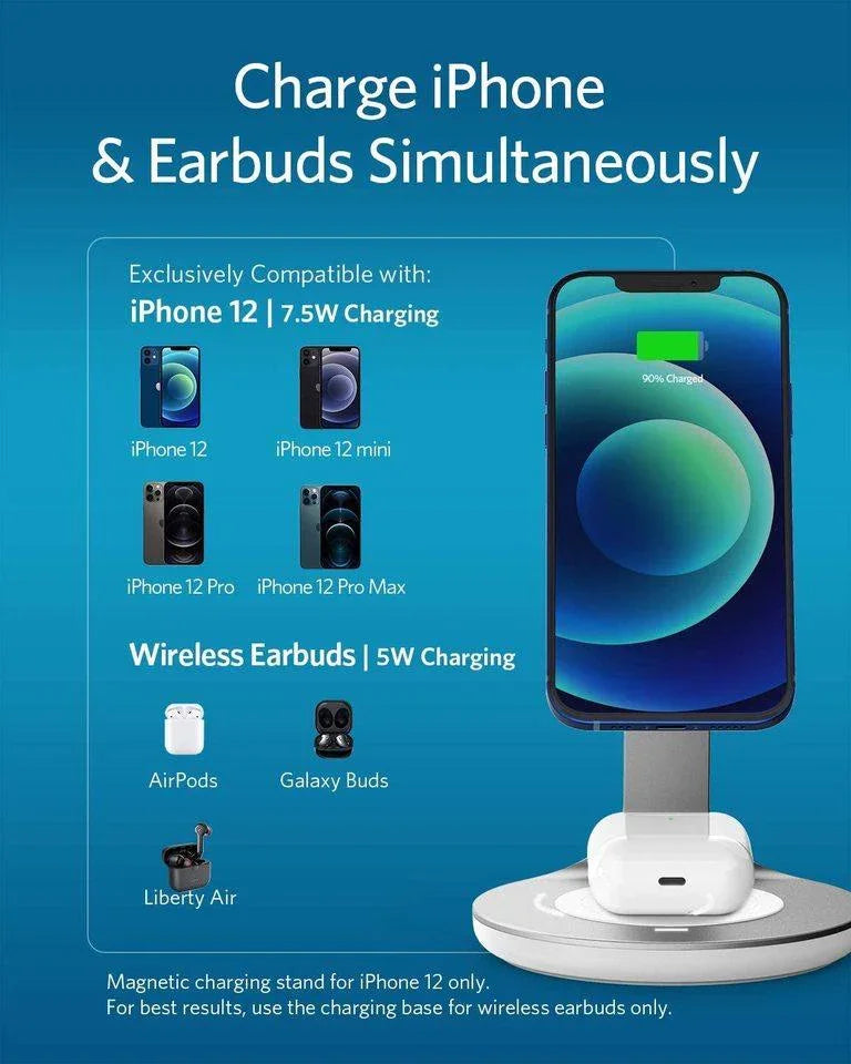 • Dual Device Charging: While the magnetic stand charges your iPhone 12, charge AirPods or other earphones on the charging pad below.